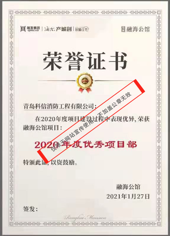祝賀科信消防公司榮獲海爾產(chǎn)城創(chuàng)融海公館項(xiàng)目“2020年度優(yōu)秀項(xiàng)目部”稱號(hào)