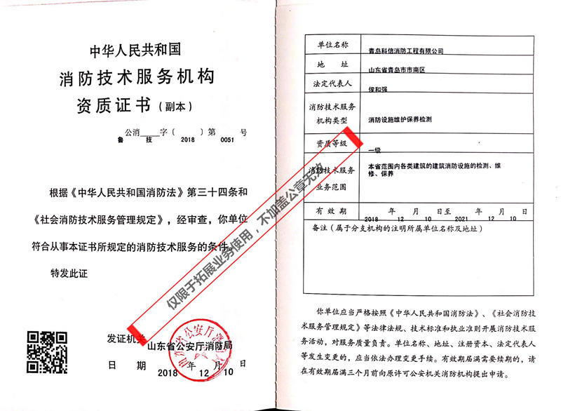 熱烈祝賀我公司-青島科信消防工程有限公司取得“消防維保檢測一級正式資質(zhì)”、“消防安全評估正式資質(zhì)”,歡迎新老客戶蒞臨指導!