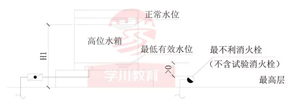 高位消防水箱指符合規(guī)范要求的靜壓滿足最不利點(diǎn)消火栓水壓的水箱,利用重力自流供水,設(shè)置在建筑的最高處,靜壓不能滿足最不利點(diǎn)消火栓水壓時(shí),應(yīng)設(shè)增壓穩(wěn)壓設(shè)施。發(fā)生火災(zāi)時(shí),通過啟動(dòng)消防水泵提供滅火用水量。